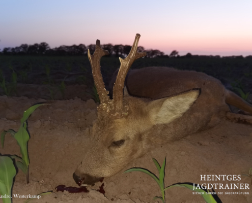 Sie haben von einem Hochsitz aus einen Rehbock auf einem Maisacker beschossen, der nach einer Flucht von 60 Metern zusammenbricht. Was tun Sie?